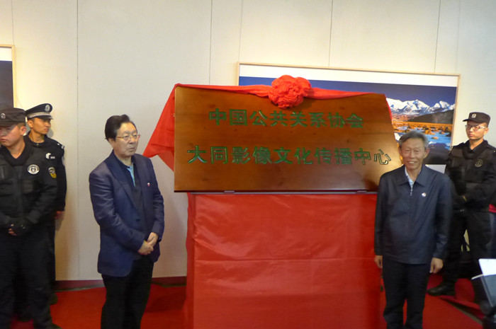 中国公共关系协会“镜美华夏”影像文化品牌文化总监胡颖(左)和大同市政协主席柴树彬(右)共同为“中国公共关系协会大同影像文化传播中心”揭牌