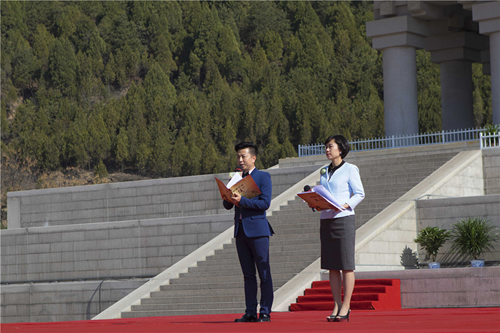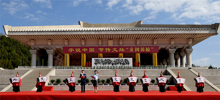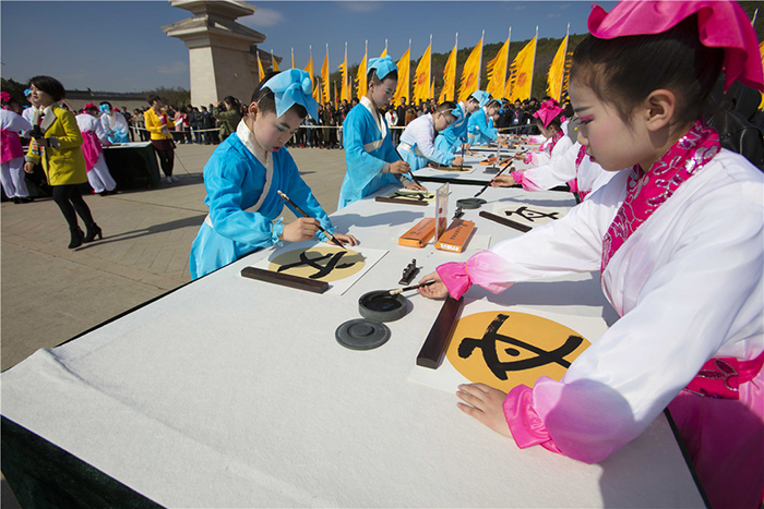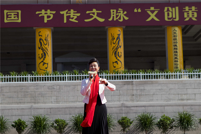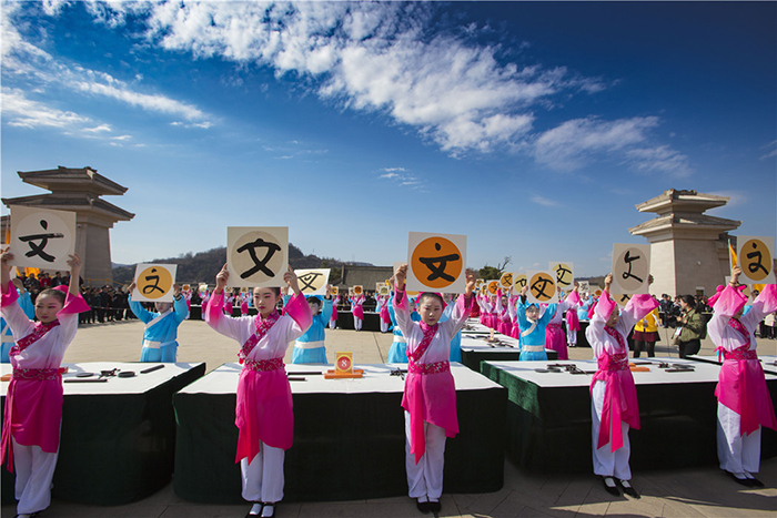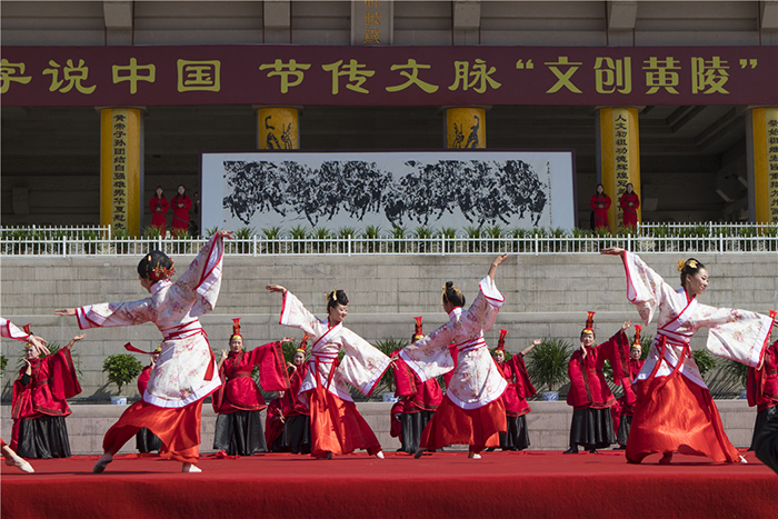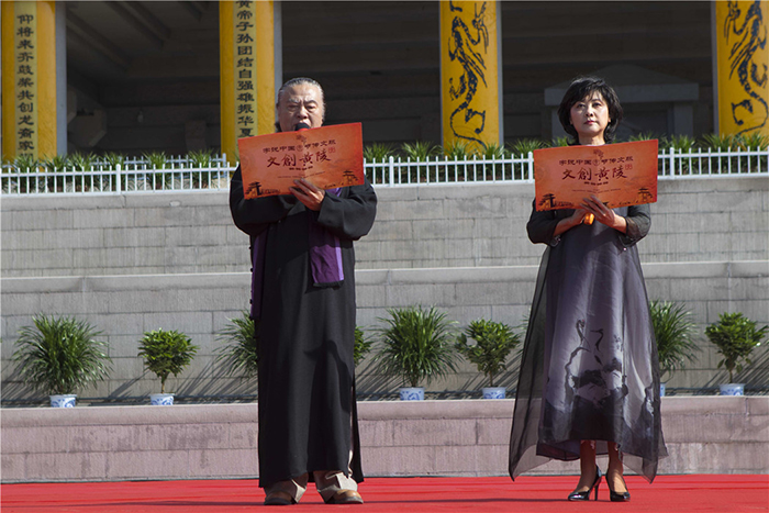 一是“文唱圣魂”:“吟唱祭圣祖,齐颂和谐曲。”通过吟唱祭奠人文圣祖——黄帝的千秋功德和传播中华民族优秀的传统文化,彰显中华民族的精神特质。由国家一级演员朱琳和中央电视台中国电视剧制作中心导演、演播艺术家李野墨现场合诵毛泽东诗词《祭黄帝陵文》拉开了活动的序幕。著名歌唱家于文华演唱了《美丽中国》和中国优秀传统文化的经典《兰亭序》。“文创黄陵”大型文化创意活动,首创“字说+节传”的独特传播方式,创新推出“字说黄陵”之“文”字,由著名雕塑家李小超打造的五米高“文”字雕塑,表达对中华文明起源——文字的致敬,也寓意五千年中华民族在滋养华夏文明的同时与世界文明共生、共享。