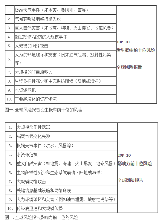 尽管两份榜单不尽相同,但环境问题在发生概率排名前五的风险中占了三位,在影响力排名前五的风险中占了四位。