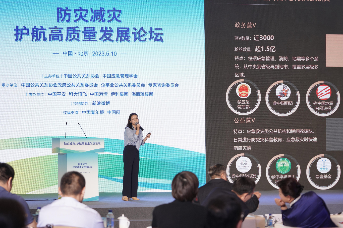 黄琴从微博助力防灾减灾与应急协作网络运用视角,分享社交媒体平台助力防灾减灾工作的心得体会。她表示,目前微博已经建立了较完备的应急矩阵,包括政务蓝V、公益蓝V,政橙V和公益橙V;微博防灾减灾科普内容传播逐渐成熟和完善,联合众多的政务官V发起了丰富多元的防灾减灾类科普栏目;微博充分利用平台生态,打通全平台所有大V参与防灾减灾传播,通过跨界传播、整合传播,扩大科普范围。此外微博还强化应急协作网络,线上线下广泛参与,引导各类主体参与,丰富参与渠道。