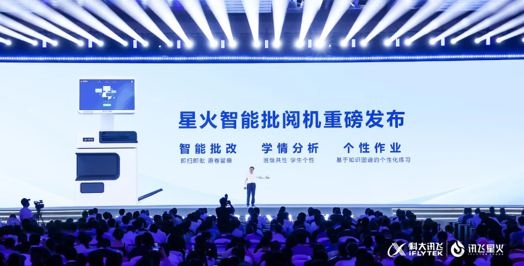 得益于底座大模型的升级和面向教育复杂场景的图文识别效果进一步提升,科大讯飞发布首款星火智能批阅机,集智能批改、学情分析、个性作业于一体,它支持自由排版、不限纸张大小的作业,在支持多学科多题型智能批改的同时,还能即时生成多维学情报告,为老师作业讲评和面批辅导提供了素材。刘聪在现场演示了星火智能批阅机批改作业的全流程,15份学生作业半分钟就能批改完成,批改还模拟了真人笔迹,和老师平时批改作业几乎一样。